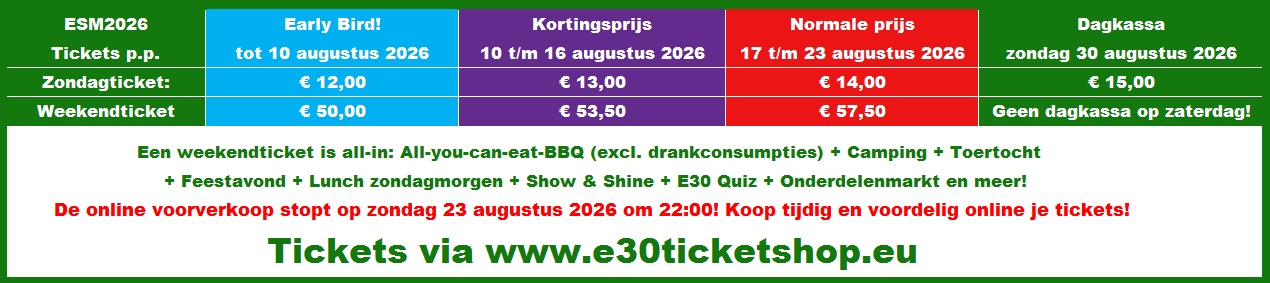 Hieronder vind je alle info kort opgesomd over de E30 Summer Meet, klik boven in het menu op de diverse onderwerpen voor uitgebreide info.